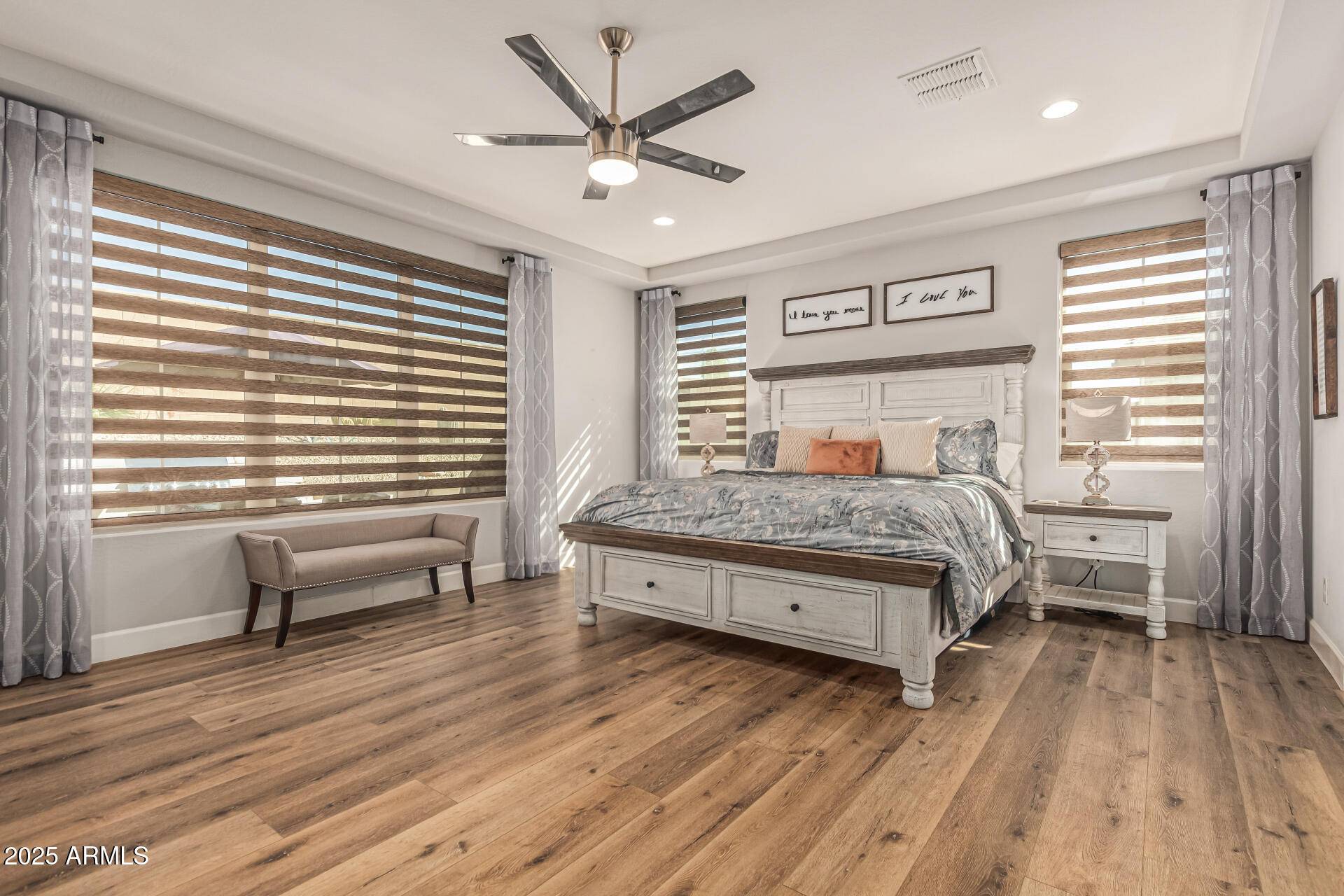 Stunning Upgraded Estrella Mountain Ranch Pool home checks every box! Open floor plan, soaring ceilings, OWNED Solar & Decorator Finishes.Hunter Douglas window treatments, plantation shutters, designer lighting compliments every space! Enjoy the Culinary Dream kitchen w/ custom tile backsplash, Walk in pantry, granite counters & island, stainless appliances, Show-stopper 6 ft built-in fridge! Relax in spacious Primary suite with luxurious spa-style bath, double vanities, glass surround shower, soaking tub & built-in closet organizers. Entertainers' backyard boasts heated pool w/water feature, built-in bbq, putting green & dog run! Addtl 4 bedrooms have access to secondary living space! Community features lakes, world-class fitness centers, pools, water park, golf, hiking trails & More! Upgrade List for 15217 S. 182nd Drive